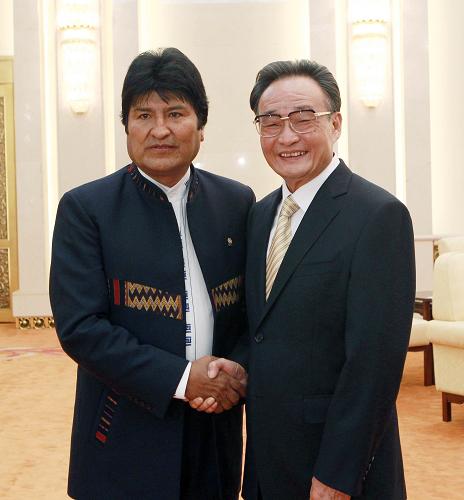 吴邦国首先欢迎莫拉莱斯访华并出席深圳大学生运动会开幕式。他说,中玻建交26年来,两国友好合作关系不断取得积极进展。双方始终相互尊重、平等相待,政治互信不断增强,经济上优势互补、互惠互利,人文领域交流互鉴、取长补短,在国际和地区事务中相互协调、密切配合。中方对两国关系表示满意。