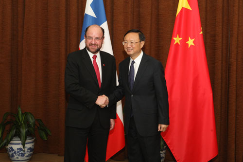 2012年8月9日,外交部长杨洁篪会见率拉美和加勒比国家共同体“三驾马车”代表团访华的智利外长莫雷诺。双方就双边关系和共同关心的问题交换了意见。