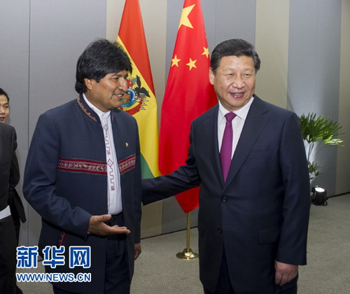 2014年7月16日,国家主席习近平在巴西利亚会见玻利维亚总统莫拉莱斯。