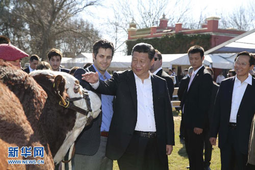 习近平受到农场主莫内塔家人热情迎接。莫内塔向习近平介绍,庄园畜养牲畜近万头,培育了许多优秀种马和肉牛品种。习近平边听边详细询问牲畜养殖和农场经营情况。习近平指出,阿根廷是农牧业大国,农业现代化水平和科技水平很高。中国也是农业大国。中国要发展,必须首先解决好13多亿人口吃饭问题。中国高度重视农业,坚持立足国内、确保粮食自给自足,同时积极利用国际市场,参与国际合作,调剂农副产品。中方愿意同阿方加强农业领域合作,扩大农产品贸易。