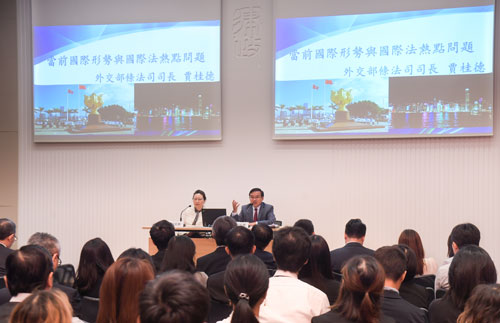 11日,贾桂德司长应邀为特区公务员做了题为“当前国际形势与国际法热点问题”的专题讲座,并就国际法相关问题与现场听众互动交流。