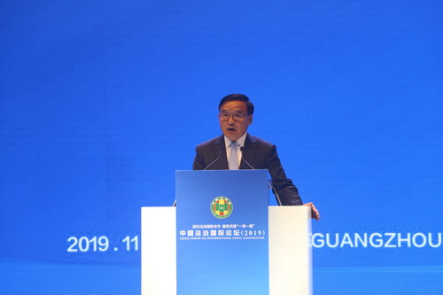 2019年11月10日至11日,中国法学会主办的中国法治国际论坛(2019)在广州成功举行。国家主席习近平向论坛致贺信指出,推动共建“一带一路”,需要法治进行保障。中国愿同各国一道,营造良好法治环境,构建公正、合理、透明的国际经贸规则体系,推动共建“一带一路”高质量发展,更好造福各国人民。希望大家围绕“深化中国法治国际合作,服务共建‘一带一路’”的主题,加强交流、增进共识,积极促进相关法律制度发展和完善,使法治在共建“一带一路”进程中更好发挥作用。