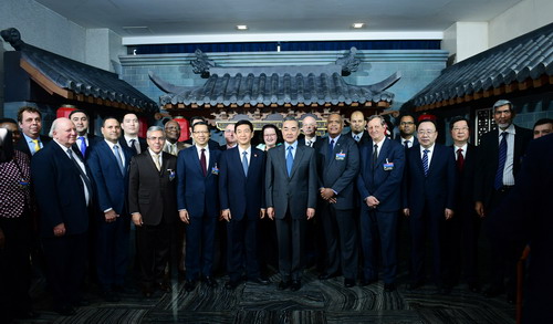 骆惠宁表示,近年来,山西新转型呈现出强劲态势,取得了积极成效。山西新转型的主要目标,就是按照习近平总书记的指示精神,建设国家资源型经济转型示范区、打造全国能源革命排头兵、构建内陆地区对外开放新高地。山西将进一步融入“一带一路”建设,加强与世界各国的经济往来和合作共赢。楼阳生从创新发展、文化传承、绿色生态、幸福民生、开放优势等方面对山西进行了推介,邀请各国朋友共享转型发展新机遇,共赢开放合作新未来。