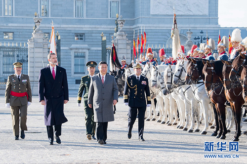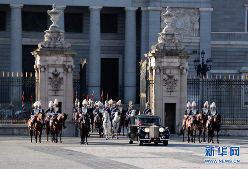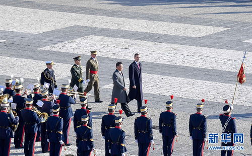 习近平和夫人彭丽媛乘皇家礼车在身着礼服、骑着高头大马的西班牙皇家卫队骑兵护卫下,前往武器广场。抵达时,鼓乐齐鸣,费利佩六世国王和莱蒂西娅王后上前迎接,互致问候。费利佩六世向习近平介绍王室高级官员。随后,两国元首夫妇一同登上检阅台。在21响礼炮声中,军乐团奏中国、西班牙两国国歌。仪仗队长趋前请习近平检阅。习近平在费利佩六世国王陪同下依次检阅步兵方队、骑兵方队和摩托车队。习近平同西方陪同人员握手,费利佩六世国王同中方陪同人员握手。两国元首夫妇返回检阅台,观看分列式。在摩托车队引领下,整齐的军乐队、雄赳赳的步兵方队、威武的骑兵方队依次通过检阅台。