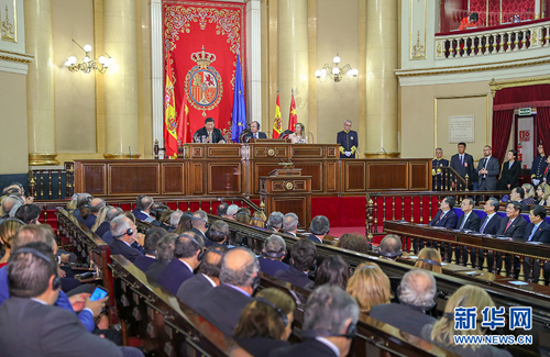 习近平抵达参议院时,西班牙参议长埃斯库德罗和众议长帕斯托尔上前迎接,随后陪同习近平登上典礼台。乐队奏中国、西班牙两国国歌。进入会议厅,习近平同参、众两院主席团成员和各党团负责人一一握手。