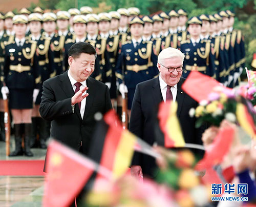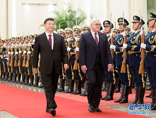 2018年12月10日,国家主席习近平在人民大会堂同德国总统施泰因迈尔举行会谈。两国元首一致同意,加深互信,合作共赢,推动中德全方位战略伙伴关系继续深入发展,让中德合作取得更多有利于两国和两国人民、有利于世界和平与繁荣的成果。