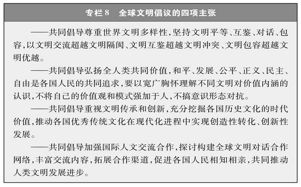 ——中国提出全球文明倡议,共同倡导尊重世界文明多样性,共同倡导弘扬全人类共同价值,共同倡导重视文明传承和创新,共同倡导加强国际人文交流合作。全球文明倡议向全世界发出增进文明交流对话、在包容互鉴中促进人类文明进步的真挚呼吁,为推动构建人类命运共同体注入了精神动力。