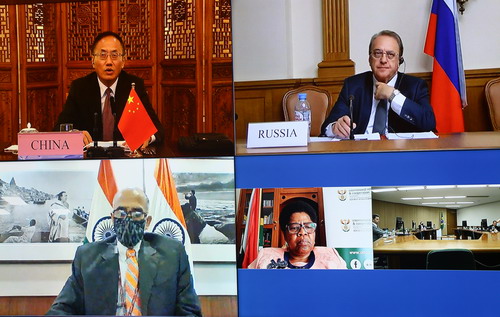 陈晓东表示,当前中东北非很不太平,新冠肺炎疫情仍在蔓延,地区热点问题此起彼伏。金砖国家及时沟通、凝聚共识,在地区问题上发出一致声音具有重要意义。要为地区国家抗疫提供支持,帮助地区恢复安全与发展;要旗帜鲜明捍卫多边主义,反对单边霸凌;要坚持政治解决,促进对话谈判;要坚持打击恐怖主义,维护好共同安全。
