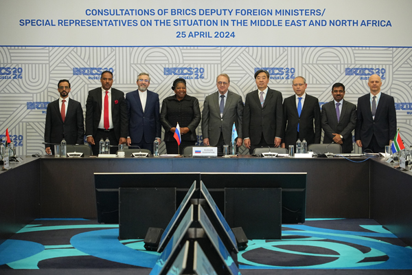 2024年4月25日,金砖国家中东事务副外长/特使磋商在俄罗斯莫斯科举行。俄罗斯副外长博格丹诺夫主持会议。中国政府中东问题特使翟隽率团与会。