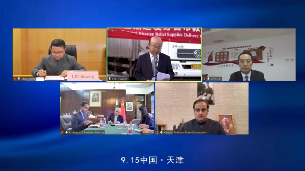 2022年9月15日,外交部亚洲司司长刘劲松在线出席天津市援助巴基斯坦友好省市救灾物资启运仪式,讲话要点如下: