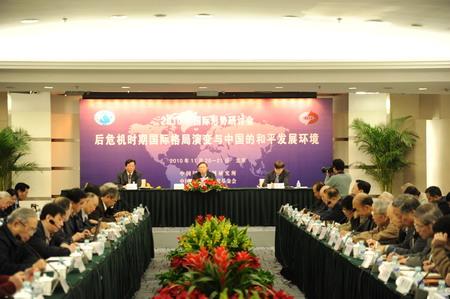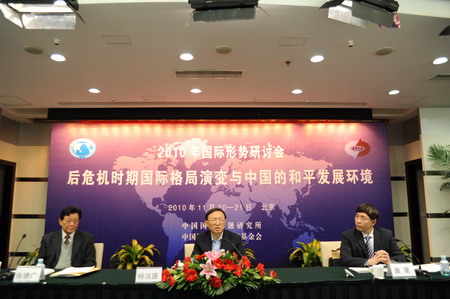 2010年11月20日上午,杨洁篪部长出席了由中国国际问题研究所和中国国际问题研究基金会联合举办的2010年国际形势研讨会,并作了题为《当前国际格局的演变和我国外交工作》的报告。杨部长就如何认识后危机时期国际格局的变化进行了深入阐述,对十一五时期外交工作和十二五时期外交总体思路、以及当前外交工作等作了全面介绍。杨部长希望大家把国际问题研究与外交工作需要更紧密地结合起来,不断丰富和发展中国特色外交理论,充分发挥自身独特优势积极开展公共外交,为服务国家总体外交做出积极贡献。