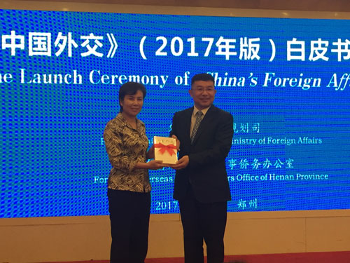 2017年7月5日上午,外交部政策规划司与河南省外事侨务办公室在郑州联合举办2017年版《中国外交》白皮书推介会。河南省副省长舒庆会见外交部政策司推介小组一行。河南省外侨办主任宋丽萍、外交部政策规划司副司长周剑分别致辞。河南省外侨办及省直机关干部、有关企业和专家学者、各大媒体等近200位各界人士出席。