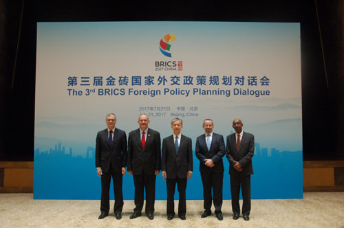 2017年7月21日,第三届金砖国家外交政策规划对话会在北京举行。对话会由中国外交部政策规划司代司长汪文斌主持,南非国际关系与合作部地区组织司司长马尔科姆森、巴西外交部政策规划司司长贝利、俄罗斯外交部政策规划司司长斯捷潘诺夫、印度外交部政策规划司司长达门德拉率团与会。