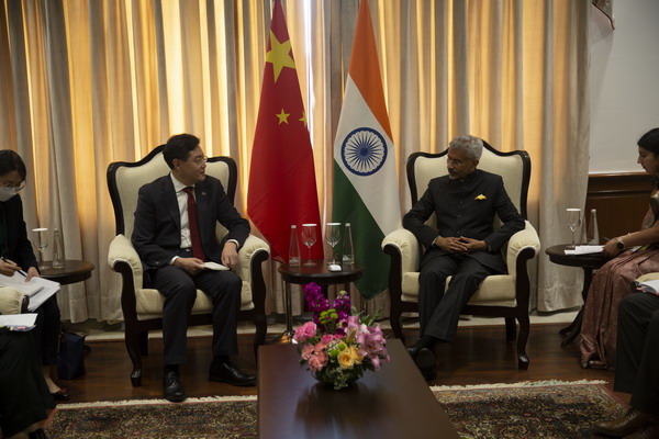 当地时间2023年3月2日,外交部长秦刚在新德里出席二十国集团外长会期间会见主席国印度外长苏杰生。