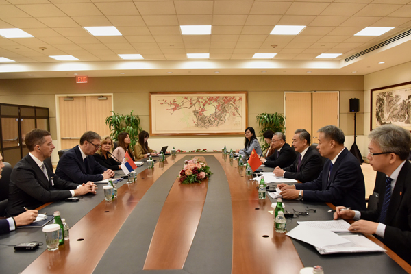 当地时间2024年9月24日,塞尔维亚总统武契奇在纽约联大期间会见中共中央政治局委员、外交部长王毅。