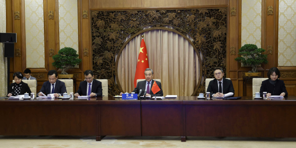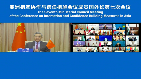 2024年12月17日,中共中央政治局委员、外交部长王毅以视频方式出席亚洲相互协作与信任措施会议第七次外长会议。