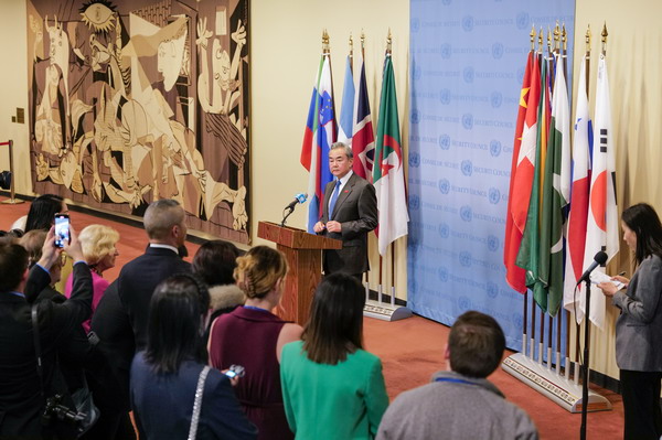 当地时间2025年2月18日,中共中央政治局委员、外交部长王毅在主持联合国安理会“践行多边主义,改革完善全球治理”高级别会议后,向媒体发表谈话。