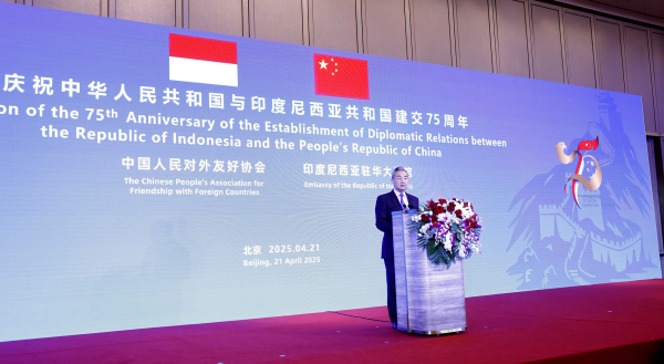 2025年4月21日,庆祝中国印尼建交75周年招待会暨万隆会议70周年纪念活动在京举行。中共中央政治局委员、外交部长王毅和国防部长董军,印尼外交部长苏吉约诺、防长沙夫里共同出席。