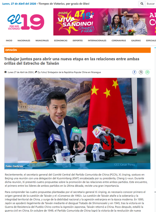2026年4月27日,驻尼加拉瓜大使瞿瑜辉在尼官媒《19数字报》发表署名文章《携手开创两岸关系新局面》,全文如下: