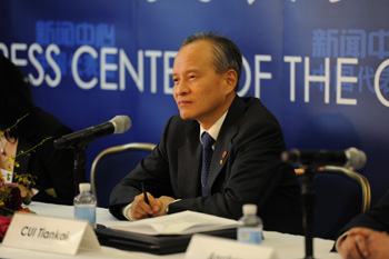 2011年1月19日,中国代表团新闻中心在华盛顿举行中外媒体吹风会,邀请外交部副部长崔天凯介绍胡锦涛主席访问美国取得的成果,并就中美联合声明有关内容、中美经贸关系、人民币汇率、朝核问题等回答记者提问。