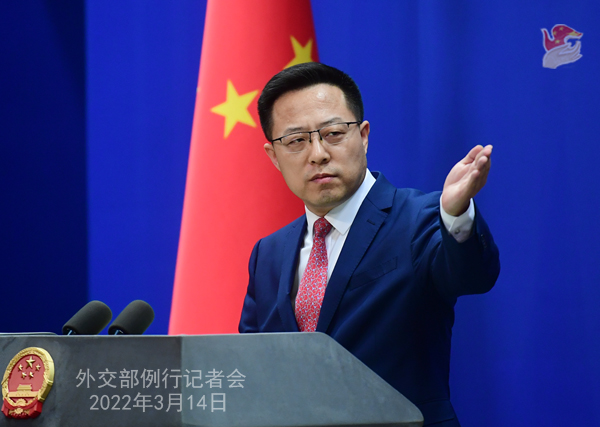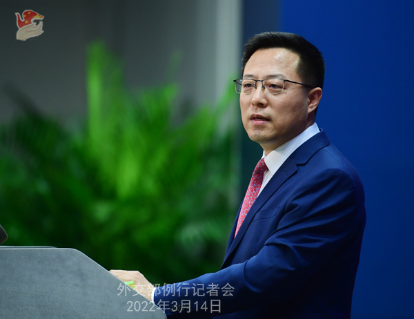 凤凰卫视记者:据报道,美国总统国家安全事务助理沙利文13日在接受采访时表示,美方认为中方事先了解俄罗斯总统普京入侵乌克兰的考量,但可能不清楚全盘计划。而中国等国不应该试图帮助俄罗斯规避制裁,美方正在密切关注中方向俄罗斯提供经济或者物质支持的程度,并已向中方表示规避制裁可能面临的后果。中方对此有何评论?
