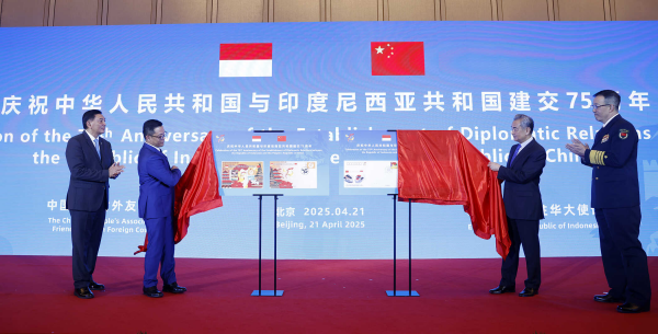 2025年4月21日,庆祝中国印尼建交75周年招待会暨万隆会议70周年纪念活动在京举行。中共中央政治局委员、外交部长王毅和国防部长董军,印尼外交部长苏吉约诺、防长沙夫里共同出席。