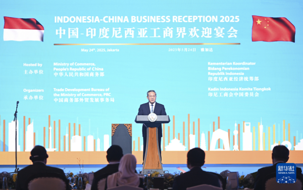 当地时间2025年5月24日晚,国务院总理李强在雅加达同印度尼西亚总统普拉博沃共同出席中国—印尼工商界晚宴并致辞。两国约200名工商界代表参加。