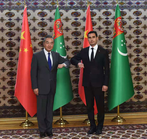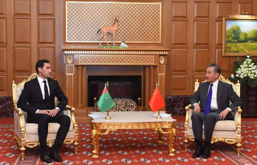 当地时间2021年7月13日,国务委员兼外长王毅在阿什哈巴德会见土库曼斯坦副总理、中土合作委员会土方主席谢·别尔德穆哈梅多夫。