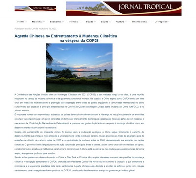 2021年10月29日,驻圣多美和普林西比大使徐迎真在圣多美和普林西比新任总统率团出席联合国气候变化大会、当地媒体予以广泛报道之际,在非屏(Téla-Nón)、透明报(Transparência)、热带报(Tropical)等当地媒体上发文,展望气候变化大会成果,宣介中方应对气候变化举措,并呼吁中圣普加强该领域合作。
