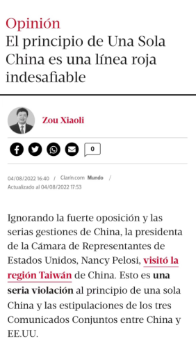 2022年8月4日,驻阿根廷大使邹肖力在阿根廷第一大报《号角报》发表题为《一个中国原则是不可逾越的红线和底线》的署名文章,详细阐释台湾问题的历史经纬和一个中国原则的法理依据,强烈谴责美国众议长佩洛西窜访台湾地区、公然进行政治挑衅的恶劣行径,揭批美挑起台海危机,成为和平的最大破坏者,重申中国政府和人民坚决挫败外部干涉和“台独”分裂势力图谋,维护一个中国原则并最终实现祖国统一的坚定决心、坚强意志和强大能力。全文如下: