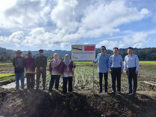 肖大使在水稻种植区将中方援赠的高产杂交水稻种子正式转交文方,并与图蒂亚蒂等一同来到水稻试验田,现场观摩由该批种子培育的稻苗插秧情况。肖大使高度评价中文农业合作取得的积极进展,希望与文方共同落实好两国元首旧金山共识,进一步深化两国粮食安全、农产品等领域合作,造福两国人民。图蒂亚蒂等感谢中方对文莱高产水稻种植研究给予的大力支持。