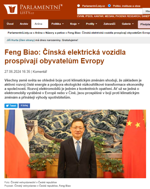 2024年6月27日,驻捷克大使冯飚在捷克媒体《议会报》发表署名文章《中国电动汽车造福欧洲人民》,强调中欧电动汽车合作良好势头不应被贸易保护主义措施所阻断。文章全文如下:
