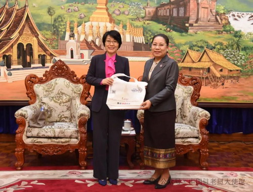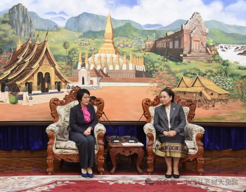 2024年8月1日,驻老挝大使方虹拜会老挝新闻文化和旅游部部长苏莎婉。