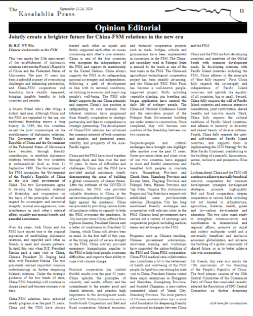 2024年9月11日,在中密建交35周年之际,驻密克罗尼西亚联邦大使吴伟在密双周刊英文报纸《你好通讯》(The Kaselehlie Press)发表署名文章《携手开创新时代中密关系更美好的未来》,回顾两国关系发展成果,宣介党的二十届三中全会精神,阐述中国对密合作理念,展望中密关系美好前景。全文如下:
