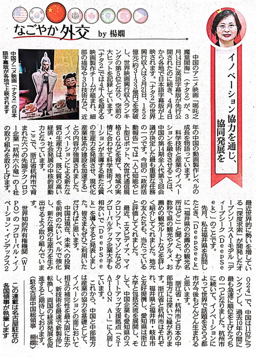 2025年3月30日,驻名古屋总领事杨娴在领区最大纸媒《中日新闻》发表题为《携手创新,共谋发展》的署名文章,主要内容如下: