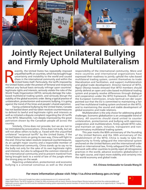 2025年4月16日,驻加拿大大使王镝在加主流媒体《国会山时报》发表署名文章《共同反对单边霸凌 坚定维护多边主义》。全文如下: