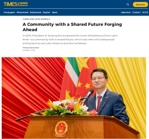 2025年5月11日,驻苏里南大使林棘在苏里南发行量最大的报纸《苏里南时报》发表署名文章《中拉命运共同体:乘风破浪正当时》,全文如下: