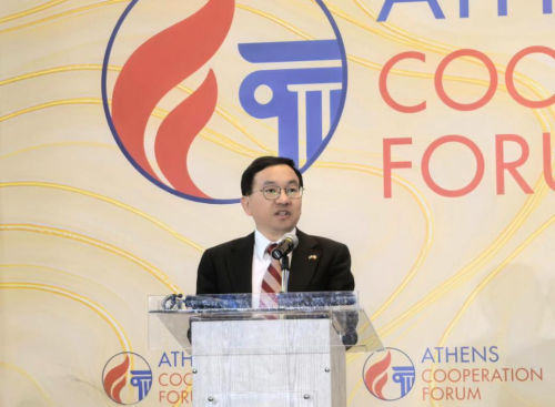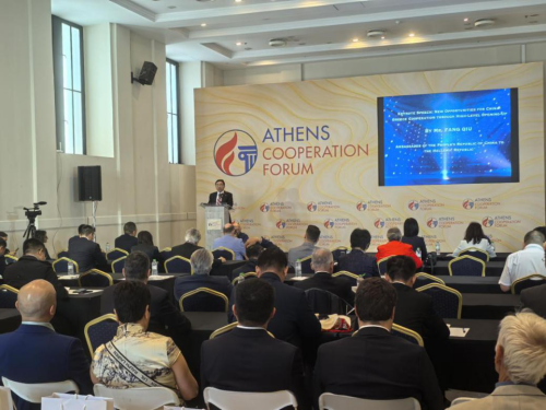 2025年5月12日,驻希腊大使方遒出席“雅典合作论坛:中国希腊合作交流对话会”开幕式,并发表题为“高水平对外开放带来中希合作新机遇”的演讲,来自希政府、金融、工商、媒体等各界百余名人士参加。