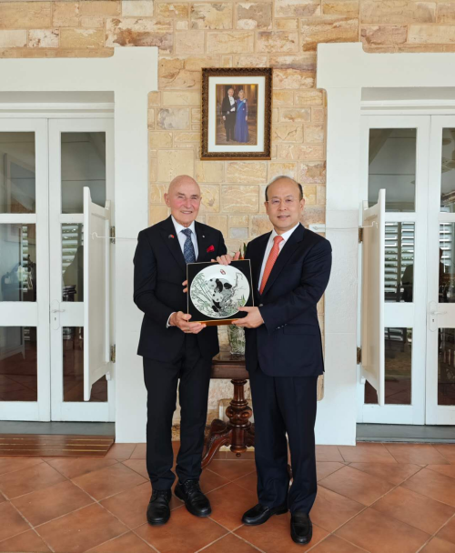 2025年5月22日,驻澳大利亚大使肖千在北领地首府达尔文行政长官府会见北领地行政长官休·赫吉。