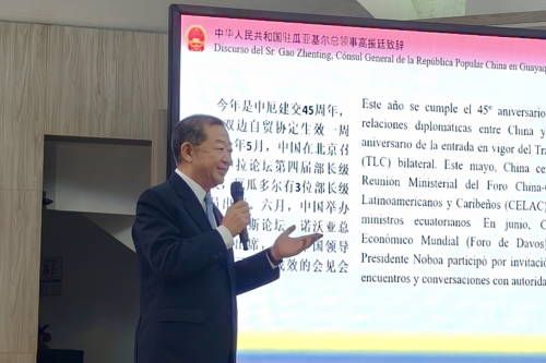 2025年8月8日,驻瓜亚基尔总领事高振廷出席瓜亚基尔圣地亚哥天主教大学举办的“中国讲坛-文化、商贸、语言:加强厄瓜多尔与中国友好关系”活动并演讲。该校校长梅拉、副校长拉米雷斯、语言学院院长阿尔梅达等多位学院院长及师生600余人出席。