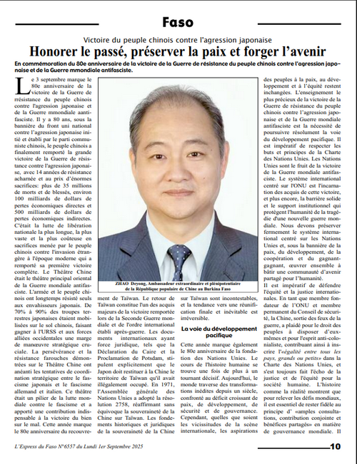 2025年9月1日,驻布基纳法索大使赵德勇在布《真理报》、《新观察者报》、《今日法索》等主流媒体发表署名文章《铭记历史、珍视和平、共创未来》,论述中国人民抗日战争与世界反法西斯战争胜利的伟大意义,强调中方将坚定捍卫《联合国宪章》宗旨和原则,维护国际规则和秩序,践行真正的多边主义,积极推动构建人类命运共同体。全文如下: