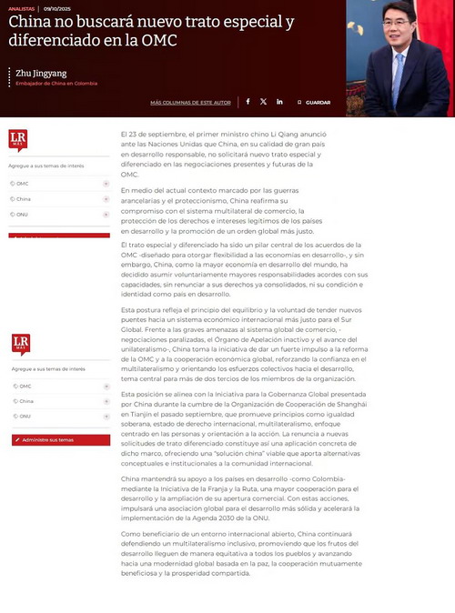 2025年10月9日,哥伦比亚主流财经媒体《共和国报》刊登驻哥伦比亚大使朱京阳署名文章《为了更加公平的国际经济秩序:中国宣布不寻求WTO新“特殊和差别待遇”》,解读中方捍卫多边贸易体制、完善全球治理格局的战略选择与深远影响。中文全文如下: