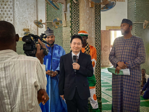 2025年11月29日,驻尼日尔大使律桂军出席首都尼亚美大清真寺修缮项目交接仪式。尼伊斯兰协会主席、清真寺大伊玛目及当地民众出席。