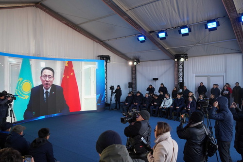 2025年12月15日,驻哈萨克斯坦大使韩春霖视频出席图尔克斯坦州萨乌兰300兆瓦光伏发电项目开工仪式并致辞。萨姆鲁克—卡泽纳国家财富基金主席扎库波夫、图尔克斯坦州州长库舍罗夫等出席。