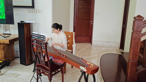 老师们和总领馆外交官们分享工作体会,表演歌曲、古筝和京剧等文艺节目,表达对祖国的美好祝福,度过了美好的时光。