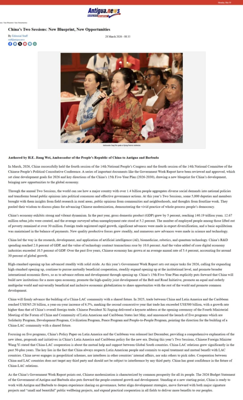 2026年3月30日,驻安提瓜和巴布达大使蒋薇在安巴主流媒体《观点速递》、《观察家报》、“安提瓜新闻网”发表署名文章《中国两会:擘画新蓝图,带来新机遇》,宣介2026年全国两会精神。全文如下: