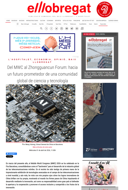 2026年4月1日,驻巴塞罗那总领事孟宇宏在西班牙《略夫雷加特报》发表署名文章《从世界移动通信大会到中关村论坛年会:共建全球科技共同体美好未来》,全文如下: