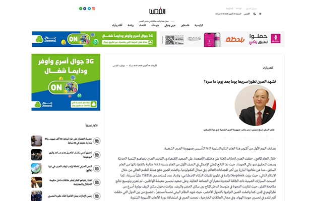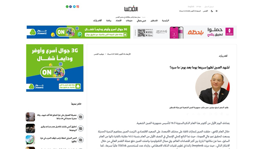 驻巴勒斯坦办事处主任曾继新在巴媒体发表署名文章《日新月异的中国,秘诀何在?》