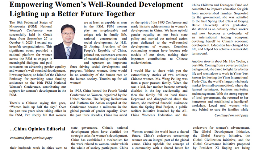驻密克罗尼西亚联邦大使吴伟在密媒体《你好通讯》发表署名文章《赋能妇女全面发展,共同点亮美好未来》