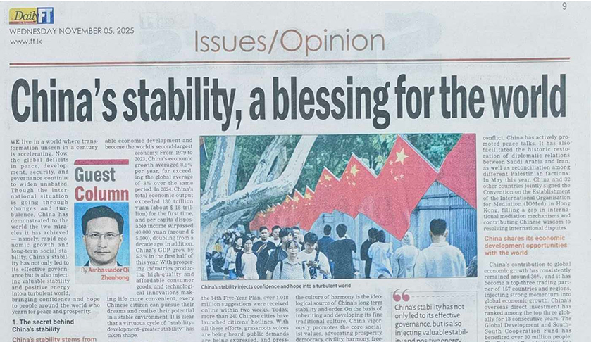 驻斯里兰卡大使戚振宏在斯媒体发表署名文章《中国之稳,世界之幸》